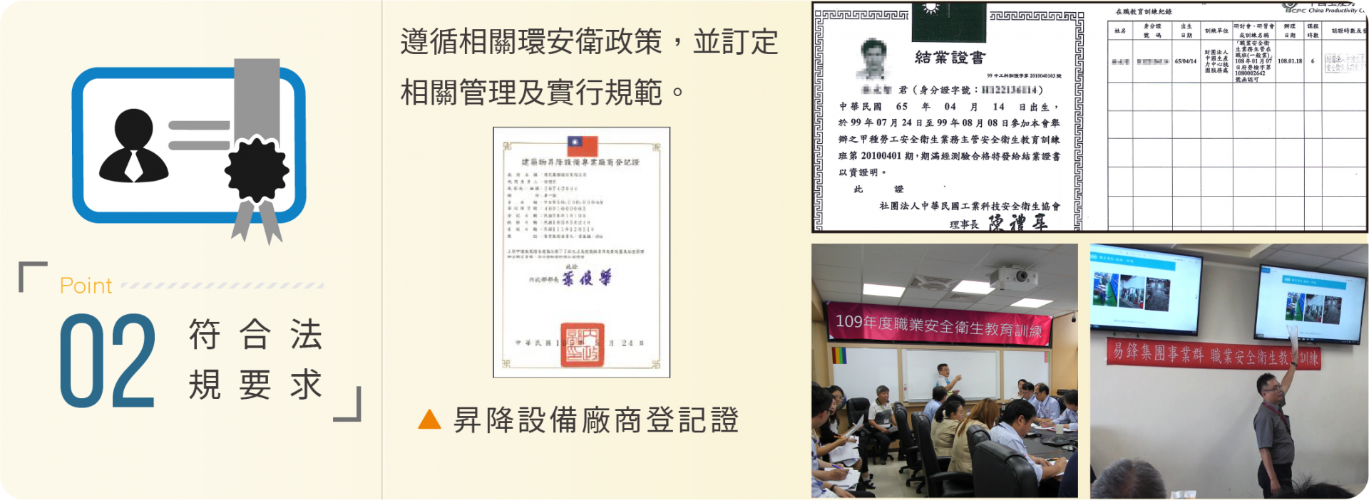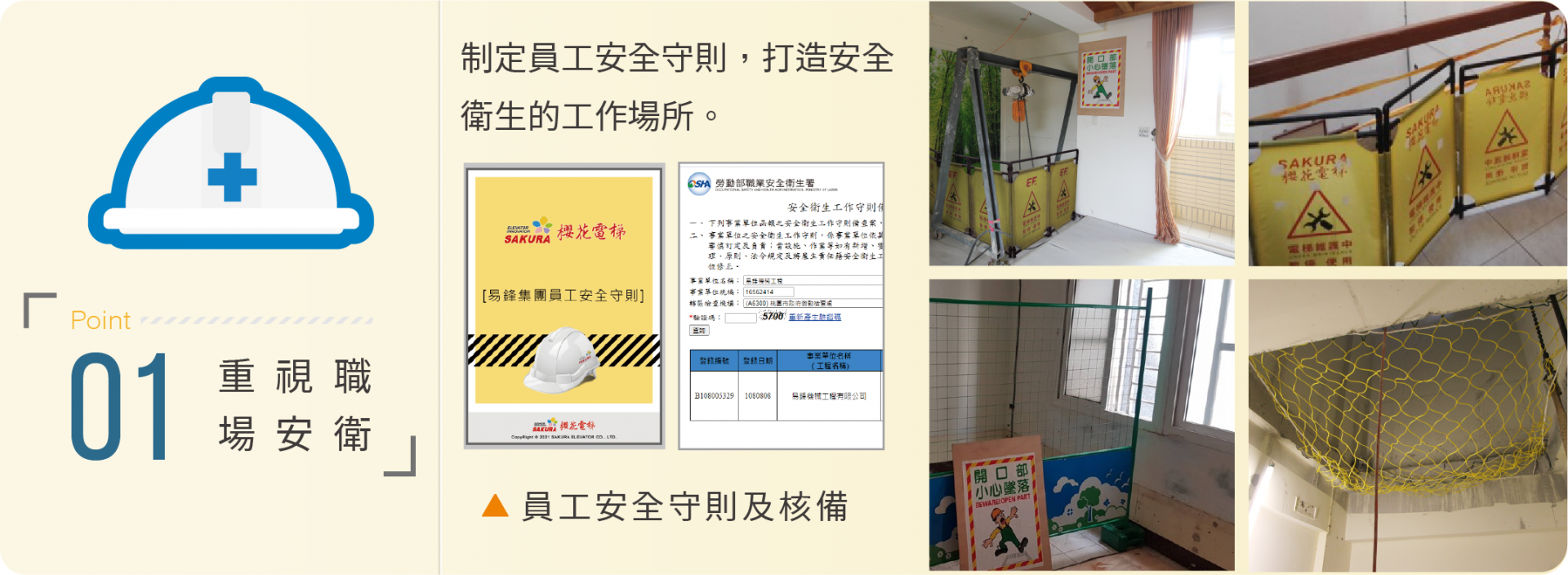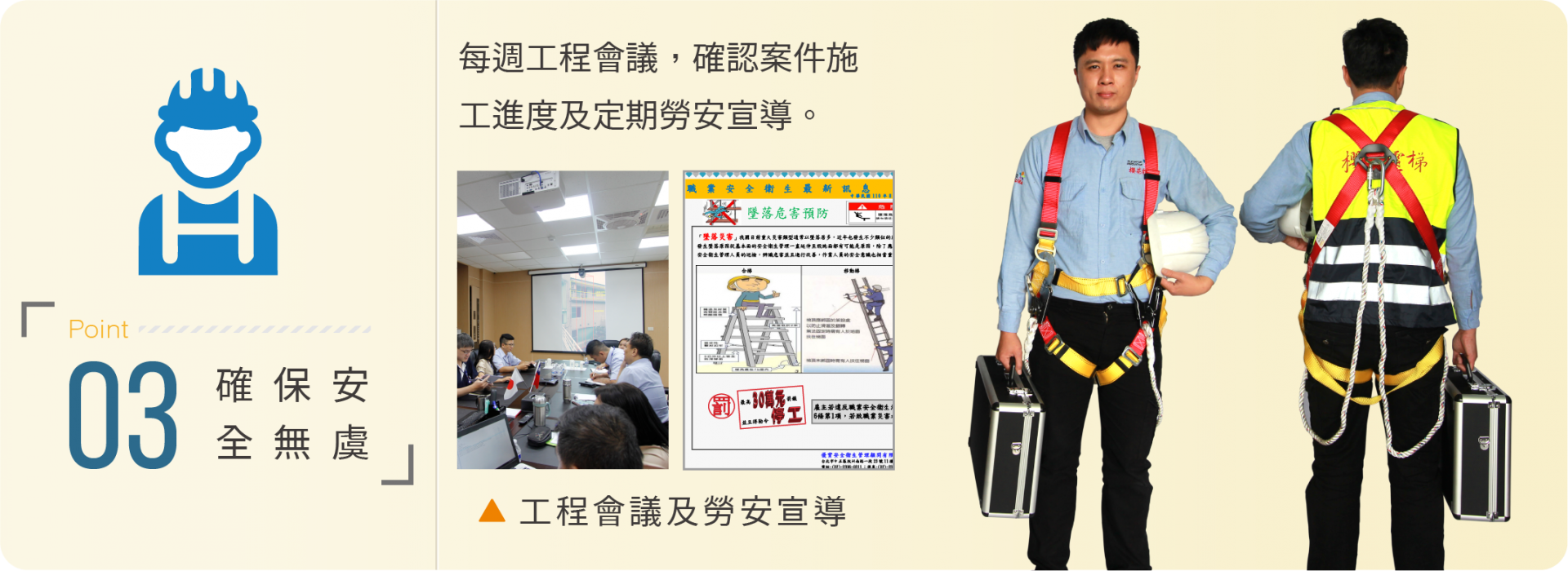 1. 重視職場安衛 : 制定員工安全守則,打造安全衛生的工作場所 2. 符合法規要求 : 遵循相關環安衛政策,並訂定相關管理及實行規範 3. 確保安全無虞 : 每週工程會議,確認案件施工進度及定期勞安宣導